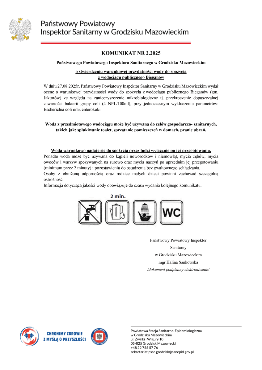 W nawiązaniu do załączonego komunikatu (PDF, 247.39 KB) PSS-E w Grodzisku Mazowieckim informuję, że Gmina Jaktorów podjęła niezwłocznie działania mające na celu wyeliminowanie zaistniałych nieprawidłowości polegające na zachlorowaniu oraz przepłukaniu sieci wodociągowej w obrębie budynku MONAR Budy Zosine.