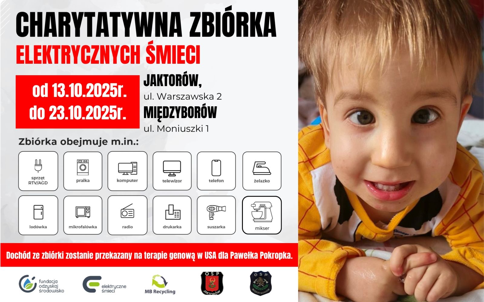Zalegający w Twoim domu zużyty sprzęt elektryczny i elektroniczny możesz zamienić na realne wsparcie. Już 13 października w Jaktorowie i Międzyborowie rozpocznie się charytatywna zbiórka elektrycznych śmieci. Mieszkańcy mogą w ten sposób wesprzeć Pawełka Pokropka, który choruje na dystrofię mięśniową Duchenne'a. Akcja potrwa do 23 października.