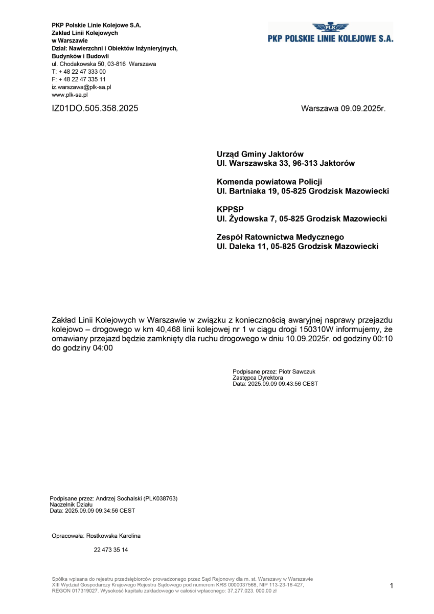 Zakład Linii Kolejowych w Warszawie informuje, że w związku z awaryjną naprawą przejazdu kolejowo–drogowego w Międzyborowie, przejazd ten będzie zamknięty dla ruchu drogowego